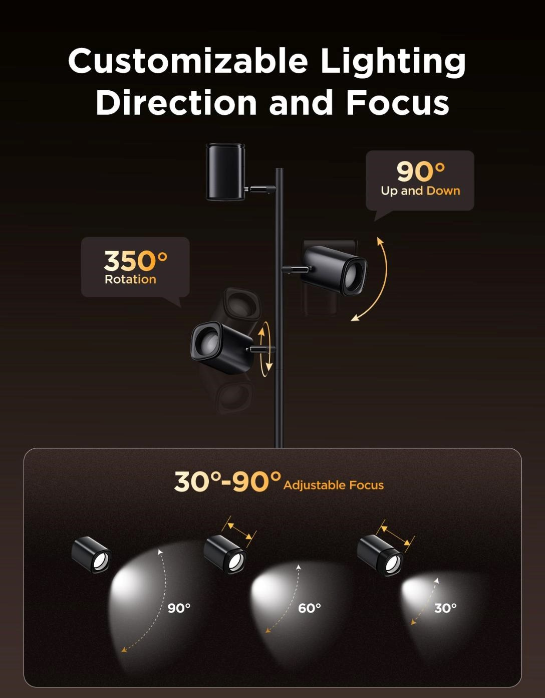 Plně nastavitelné ramena a hlavice umožňují dosáhnout dokonalého osvětlení. Lampy mají ostření v rozmezí 30°–90° pro rozptýlené nebo koncentrované světlo. Ramena se otáčejí 350° horizontálně a 90° vertikálně. To vám dává možnost přesného nasvícení každého kouta vaší místnosti.