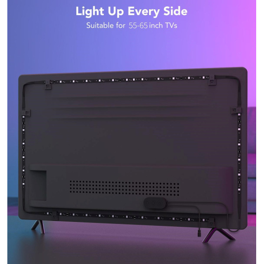 LED pásek je navržen tak, aby jednoduše pokryl všechny čtyři strany televizoru o velikosti 55-65 palců. Díky flexibilní konstrukci a přiloženým úchytům snadno dosáhnete přesného a pevného uchycení. Výsledkem je rovnoměrné podsvícení, které zaručí působivý vizuální efekt bez složité montáže.
