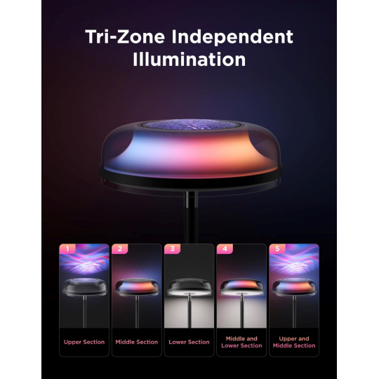 Trojité zónové osvětlení umožňuje individuálně nastavovat spodní, střední a horní část lampy podle vašich potřeb. Spodní LED poskytuje praktické každodenní světlo, střední zóna jemně osvětluje prostor a horní projekční efekt přidává dramatický vizuální zážitek. Díky tomuto systému můžete vždy vytvořit dokonalou atmosféru pro každou příležitost.