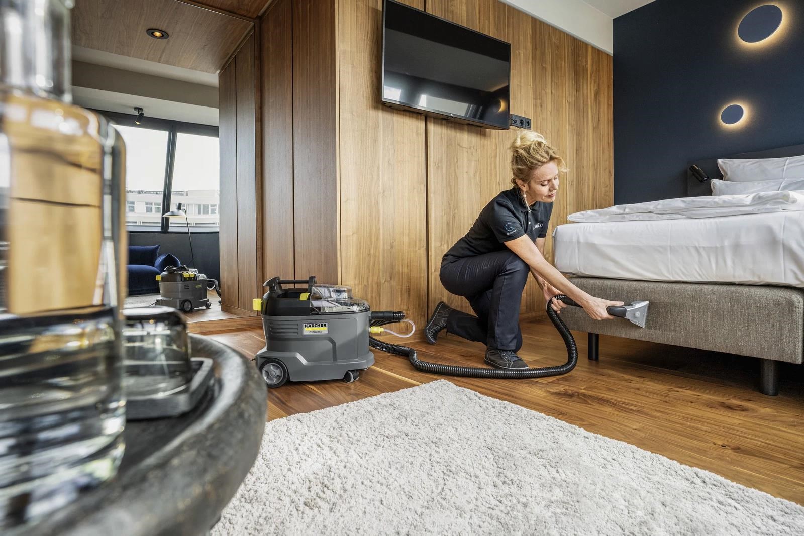 Robustní, odolný, účinný: Sprejový extrakční čistič Puzzi 8/1 působivě čistí čalounění a odstraňuje skvrny z textilních povrchů s vynikajícími a hygienickými výsledky čištění a vysokou účinností. Kompaktní sprejový extrakční stroj nastříká čisticí roztok hluboko do textilních vláken a poté jej opět odstraní s uvolněnými nečistotami. Tento vynikající výkon zpětného sání také zajišťuje rychlé schnutí a znamená, že textilní povrchy lze rychle znovu použít – ideální pro vysoké nároky profesionálů v oblasti úklidu v hotelovém a pohostinském sektoru nebo při čištění interiérů vozidel. Lze použít i standardní extra krátkou hubici na čalounění pro pohodlné a ergonomické čištění úzkých prostor. Díky velmi nízké hmotnosti a ergonomické rukojeti lze sprejový extrakční čistič snadno přenášet jednou rukou. Pohodlí pro uživatele zvyšují také velká tlačítka, která lze ovládat rukou nebo nohou. Víko přístroje a ruční tryska jsou průhledné pro lepší výhled na špinavou vodu.