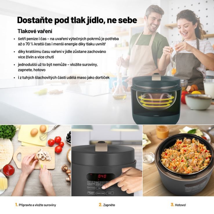 Tlakové hrnce bývaly vždy vítanými, avšak obávanými společníky v domácnosti. Energeticky úsporný víceúčelový elektrický tlakový hrnec Lauben Electric Pressure Cooker 5000AT má všechny výhody tzv. papiňáku a ještě víc, jen v moderním a bezpečném hávu. Čas i peníze šetří kratší dobou přípravy díky tlaku uvnitř, navíc takto se zachová v jídle více živin. I když nejste kuchařský mistr, oblíbíte si fakt, že do hrnce stačí dát suroviny, zapnout a on se už postará. Hrnec disponuje 9 přednastavenými programy a 3 úrovněmi požadované struktury masa. Čas přípravy ovlivníte i manuálně. 5l objem stačí pro celou rodinu, údržba je snadná, bezpečnost zajišťuje One Touch ventil pro upuštění tlaku. Jídlo udrží teplé funkce Keep Warm, lepší plánování umožní odložený start. Balení obsahuje též kuchařku.