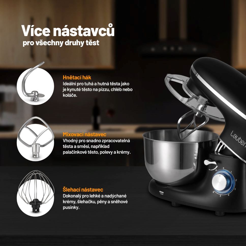 Základní balení robota zahrnuje nástavce pro šlehání, hnětení i mixování.