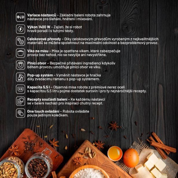 Při svých kompaktních rozměrech disponuje kuchyňský robot motorem o výkonu 1400 W, zvládne tak uhníst i tužší těsto.