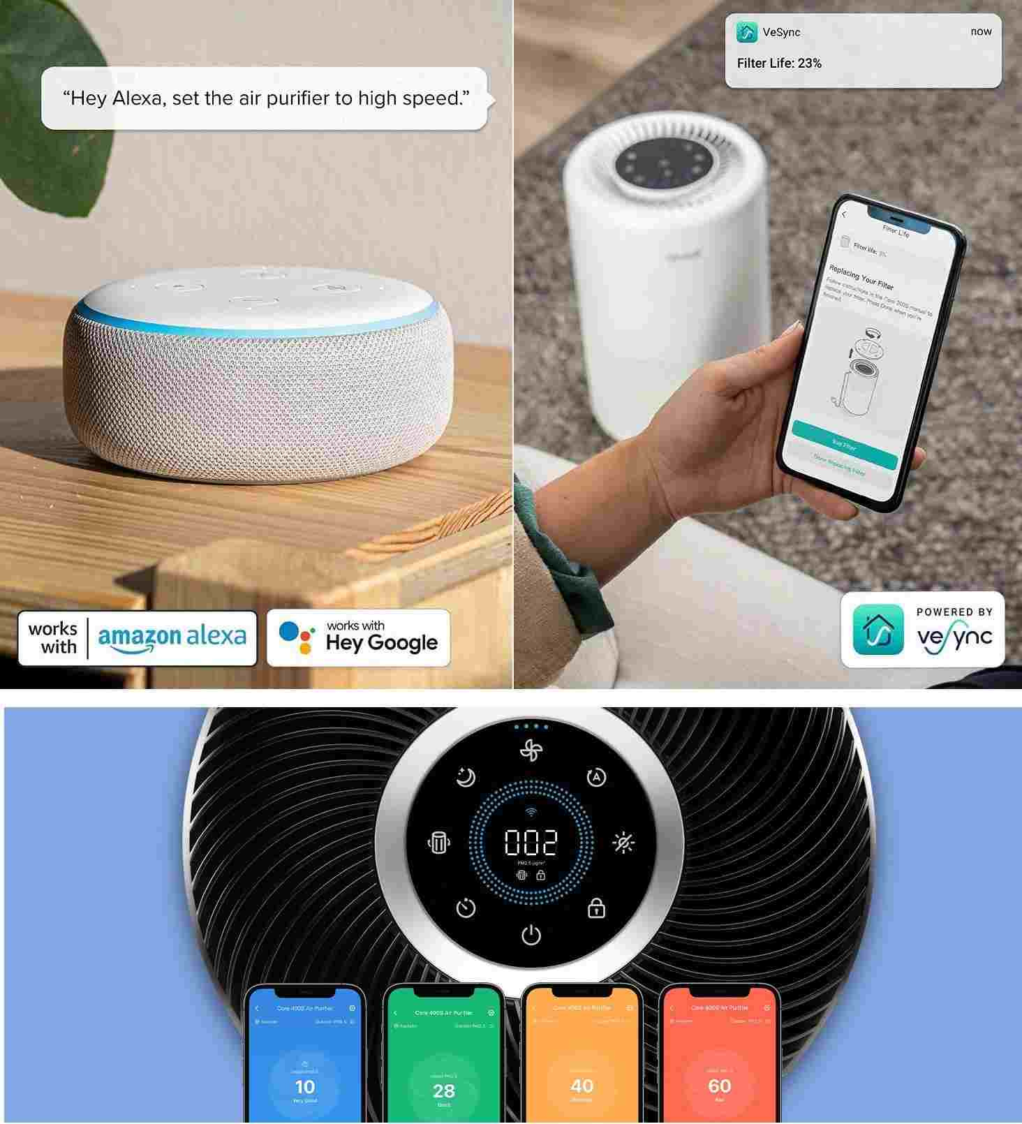 Chytrou čističku vzduchu Levoit 300S Smart můžete ovládat přímo na displeji nebo také přes aplikaci určenou pro smartphony a tabely Android a Apple. V aplikaci si můžete nastavit různé režimy, výkon, sledovat proces čištění, úroveň znečištění vzduchu nebo kondici, v jaké se filtr nachází.
