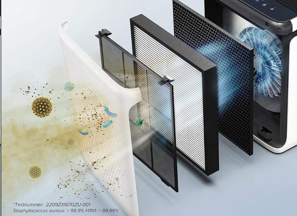 Druhou vrstvou je H13 True HEPA filtr s technologií HEPASmart™. Vylepšený staticky nabitými vlákny, která zachytí nejméně 99,97 % částic přenášených vzduchem o velikosti 0,3 mikronu, jako je jemný prach, částice kouře, plíseň, bakterie, pyl, kouřové částice, roztoče, a zvířecí srst. To odlišuje Levoit od konkurence, protože filtr HEPA H13 je mnohem kvalitnější a spolehlivější než běžně používané filtry. Nezávislé testování 220923107GZU-001.