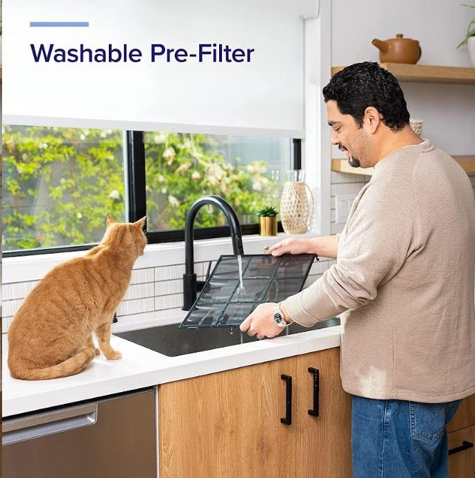 Konstrukce umožňuje uživatelům snadno vyjmout předfiltr a vyčistit jej, kdykoli je to nutné, namísto časté výměny jako u jednorázových filtrů. Možnost filtr zbavit těch nejhrubších nečistot umytím nejenže dlouhodobě šetří peníze, ale také snižuje množství odpadu, díky čemuž je Levoit Vital 100S šetrný k životnímu prostředí. Při důkladném umývání a udržování předfiltru postačí měnit filtr jednou ročně (za běžného provozu, v závislosti na podmínkách).