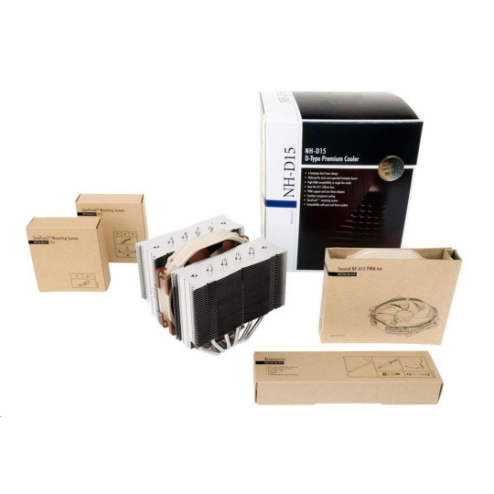chladič procesoru, socket Intel LGA2011(-3), 1156, 1155, 1151, 1150, AMD AM2(+), AM3(+), FM1, FM2(+), AM4, rozměry bez ventilátorů 165x150x135mm, hmotnost 1000/1320g, součástí balení jsou 2 ventilátory Noctua NF-A15 PWM a adaptéry L.N.A.