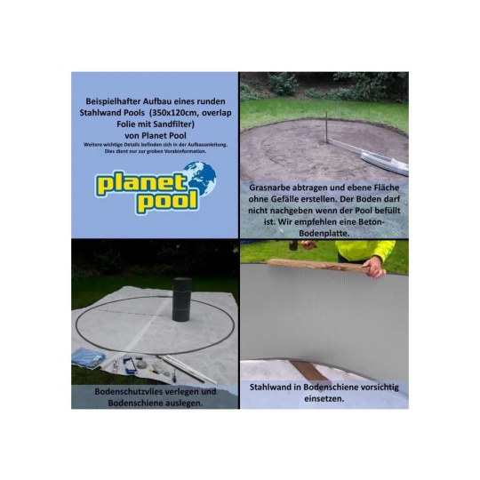 Nadzemní bazény Planet Pool s ocelovou stěnou jsou určeny pro celoroční použití. Odpadá tak potřeba bazén demontovat na podzim a znovu instalovat na jaře jako u sezónních bazénů s nafukovacím límcem či rámovou konstrukcí. Díky žárově pozinkované a nátěrem ošetřené ocelové stěně a mrazuvzdorné fólii je bazén připraven na všechny rozmary přírody. Tento bazén je velmi stabilní, pevný s dlouhou životností. Moderní ANTRACITOVÝ nátěr stěny bazénu + PÍSKOVÁ PVC závěsná folie. Bazén je vhodný pro instalaci na rovném podkladu s dostatečným odstupem od potenciálního spadu nečistot ze stromů a střech. UV stabilizace PVC folie zajišťuje je barevnou stálost a životnost. Tento bazén přestavuje osvědčenou koncepci bazénu a pozitivní historickou zkušenost. Bazén se instaluje pomocí spodních a horních lišt, do kterých se zasazuje ocelová stěna. Oba kraje stěny se propojí pomocí vnitřních a vnějších lišt a šroubů. Mrazuvzdorná folie se pomocí zalomení o horní část ocelové stěny zavěsí a vytvaruje do bazénu dle vizuálních požadavků. Folie je flexibilní a na míru vyrobena pro tento typ bazénu (není třeba žádných úprav). Pro montáž krok za krokem následujte pokyny v montážním návodu. Parametry: Tvar bazénu: kulatý tvar Rozměry bazénu: 350 x 90 cm Ocelová stěna: 0,3 mm UV stabilizovaná PVC fólie, tloušťka 0,2 mm, barva PÍSKOVÁ Barva bazénu: ANTRACITOVÁ Děrování pro standardní vestavěný skimmer a zpětnou trysku k dispozici Horní a podlahová lišta z plastu Bazén odpovídá evropské normě pro bazény EN 16562-2.