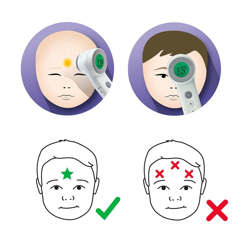 Bezdotykový + dotykový teploměr s přesností Age Precision. Patentovaný teploměr využívá technologii pro snadné, bezdotykové a neuvěřitelně přesné měření teploty. Chcete-li provést měření v dotykovém režimu, umístěte teploměr mezi obočí na čelo. V bezdotykovém režimu držte teploměr mezi obočím přibližně 2 cm před čelem dítěte. Měření je tedy bez stresu a lze jej provést bez rizika, že dítě vzbudíte. Kromě toho lze použít tichý režim, takže můžete měřit teplotu dítěte téměř neslyšně. Kromě toho můžete pomocí režimu Jídlo a tekutiny snadno měřit teplotu jídla, pití nebo vody ve vaně vašeho dítěte. Poznámka: Uživatel by měl mezi opakovanými měřeními u téže osoby počítat s přiměřeným časovým odstupem. Pro čištění vždy otřete vlhkým hadříkem a poté otřete suchým hadříkem. Nikdy nepoužívejte antibakteriální čisticí prostředky a utěrky, protože mohou přístroj nenávratně poškodit.
