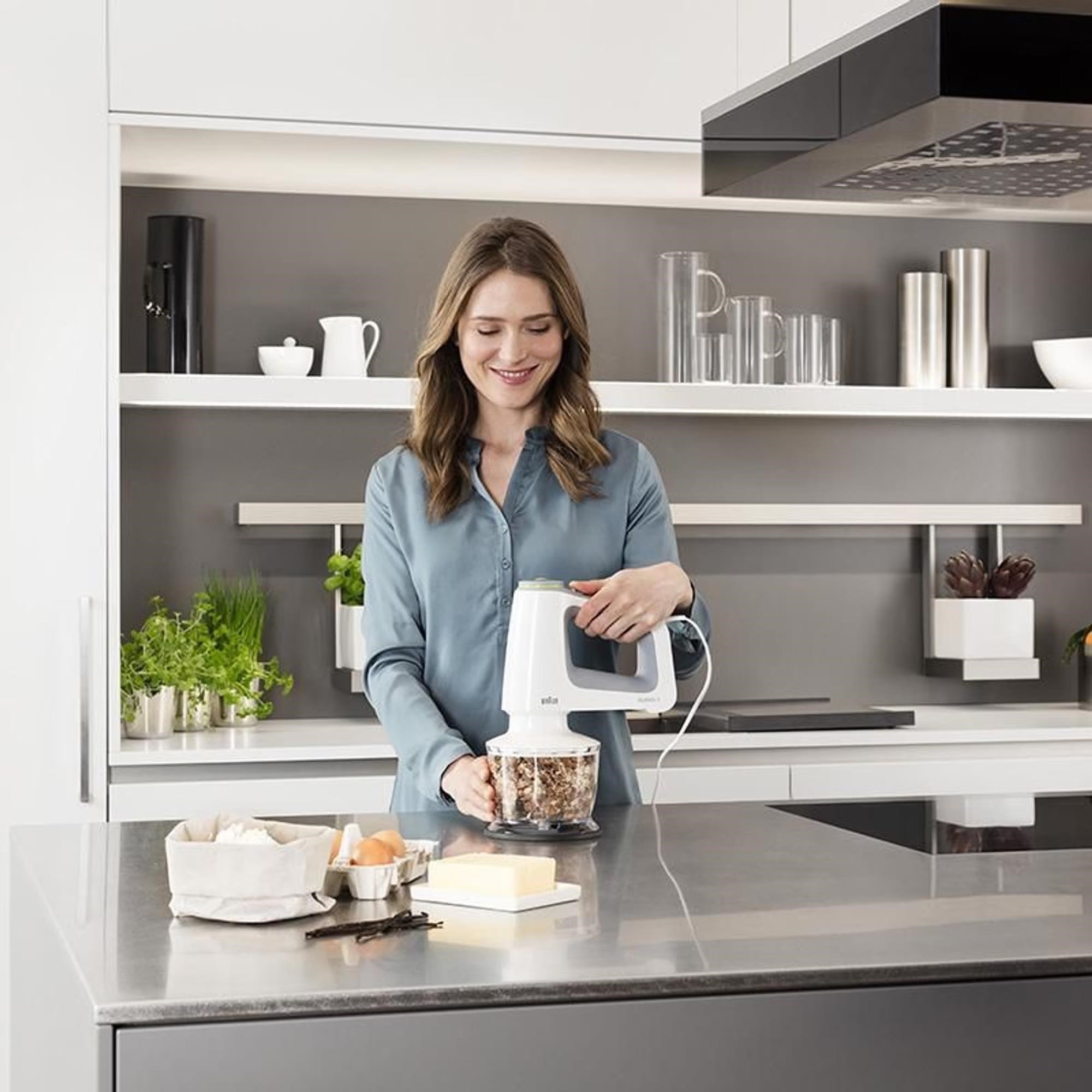 Ruční mixér Braun MultiMix 5 nabízí 750W výkonný motor a 9 rychlostí pro snadné a rychlé šlehání, hnětení a mixování. Vybrané modely současně nabízí také mixovací nohu s plastovou mixovací nádobou a sekací nástavec, takže se MultiMix 5 stává šlehačem, tyčovým mixérem a sekáčkem v jednom. Technologie SmartMix a unikátní umístění motoru přímo nad příslušenství přenáší váhu přímo do mísy, nikoliv do vaší ruky, takže je šlehání a mixování až o 40 % lehčí. Design mixéru MultiMix je hladký a bez ventilačních otvorů. Díky tomu dovnitř mixéru nepronikají nečistoty a je zajištěna delší životnost produktu. Protiskluzová měkká rukojeť SoftGrip a snadná výměna příslušenství je příjemnou tečkou.