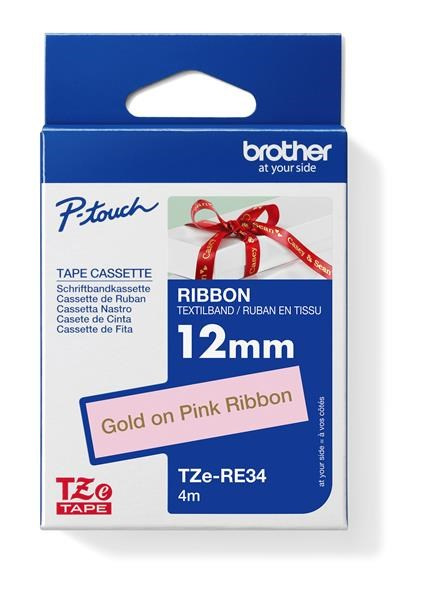 BROTHER TZE-RE34 - kazeta TZ šířky 12mm, TEXTILNÍ páska 4m- pro tvorbu dárků - NELEPÍCÍ - RŮŽOVÁ PÁSKA ZLATÝ POTISK gold