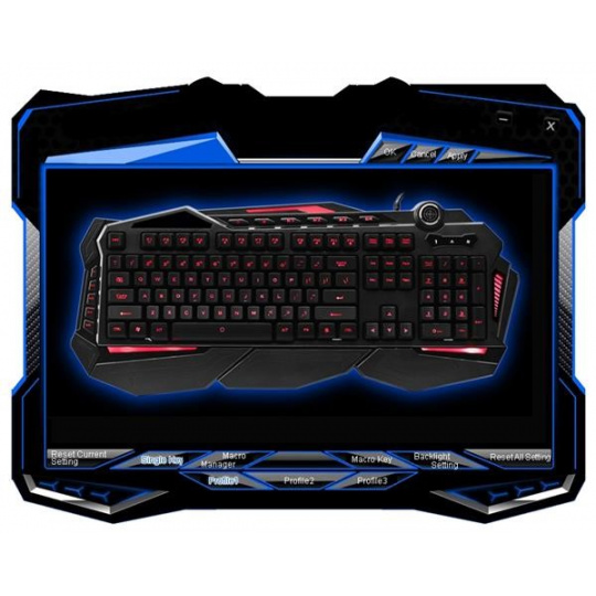 3 profily - na klávesnici naleznete klávesy pro přepínání mezi 3 nezávislými profily. Pro každý profil lze individuelně nastavit barva podsvícení, její intenzita, makra, předefinované klávesy...