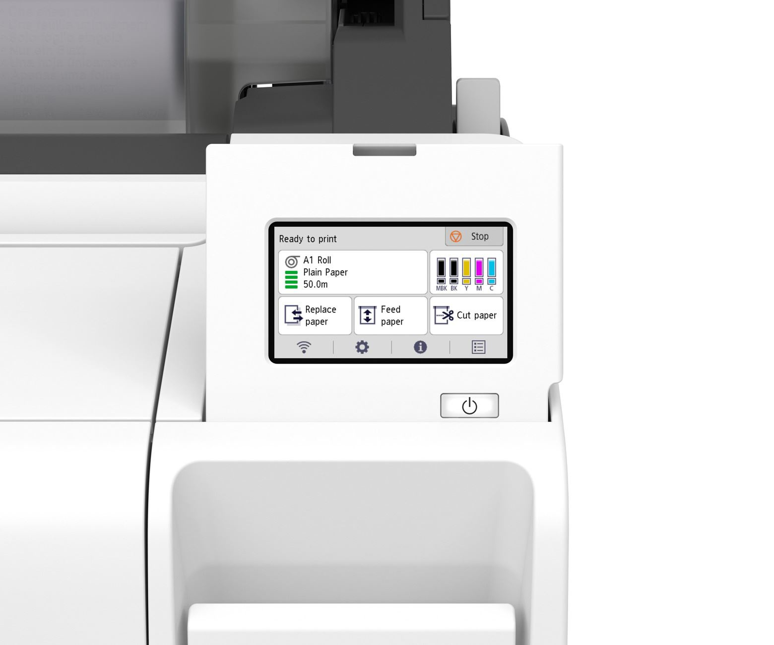 Funkční design panelu dotykové obrazovky s úhlopříčkou 4,3“ umožňuje intuitivní zobrazování pokynů a důležitých informací, jako je typ a zbývající množství média a množství inkoustu. Roli papíru lze snadno vyměnit na horním krytu s plochým povrchem.