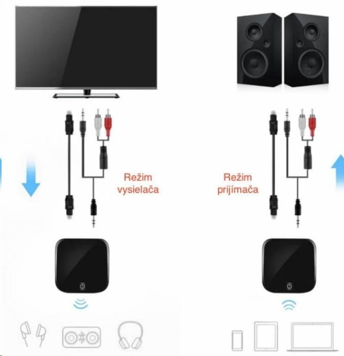 Tento vysílač a přijímač mini Bluetooth lze připojit k širokému okruhu zvukových zařízení, jako jsou MP3, MP4, TV, rádio, autorádio nebo počítač, a umožní jim připojení Bluetooth. Použitím optického zařízení Toslink / SPDIF nebo 3,5 mm audio kabelu vytvoříte několik zvukových zařízení s podporou Bluetooth. Bluetooth přijímá i vysílá, což znamená více možností použití.