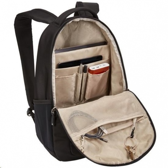 - Organizér umístěný v hlavním oddílu s různými možnostmi uložení drobné elektroniky, kabelů, příslušenství, vizitek a klíčů.