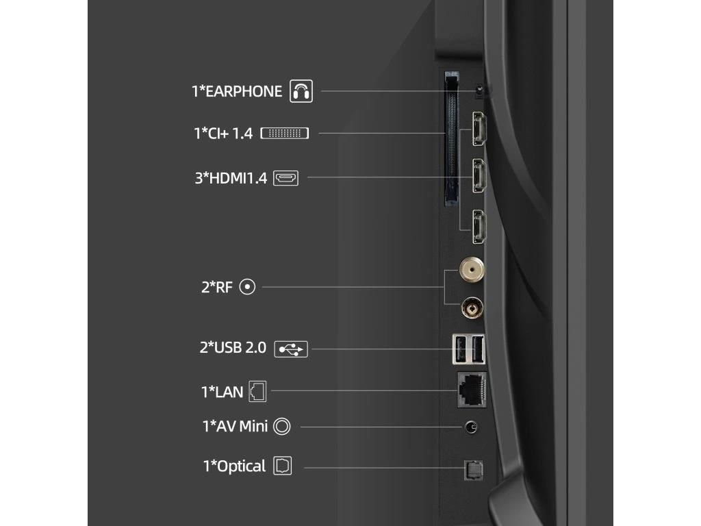| Vstupy a výstupy: | AV vstup mini, CI+, sluchátkový vstup 3.5 mm, digitální audio výstup, HDMI 1.4, USB 2.0, LAN, antény RF a LNB |