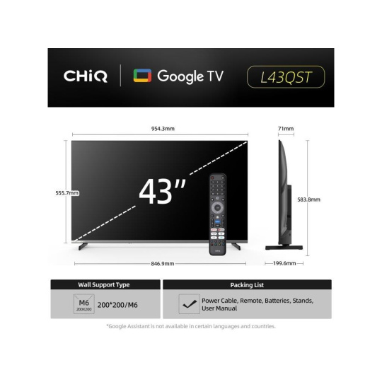 CHiQ 43“ L43QST, ultratenká bezrámečková QLED Smart Android 14 TV s HDR10, HLG, obrazovkou s Full HD s rozlišením 1920 x 1080 pixelů, prostorovým zvukem Dolby Audio a dbx-tv.