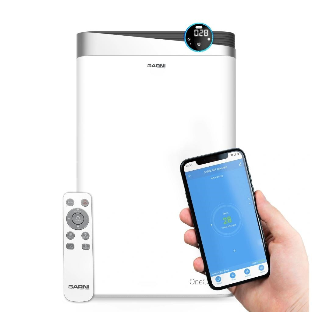 Chytrá čistička vzduchu, model GARNI 45T OneCare, zajistí ve vaší domácnosti nebo kanceláři pomocí osmistupňového filtračního systému a zabudovanému čidlu na měření pevných částic PM2.5 čistý a zdravý vzduch. Díky snadno čitelnému inverznímu LCD displeji s vysokým kontrastem, funkcí zvlhčování vzduchu, tichému chodu, automatickému a nočnímu režimu, možnosti sledovat naměřené hodnoty online a možnosti spouštění pomocí dalších zařízení je model GARNI 45T OneCare zajímavým prvkem chytré domácnosti.