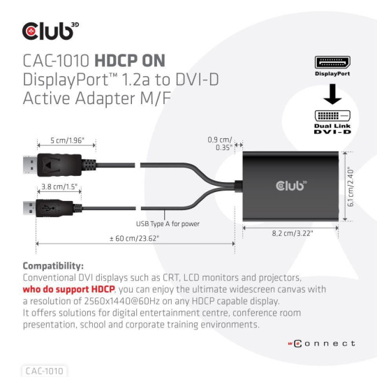 Club 3D DisplayPort ™ to DVI Dual Link Active Adapter Converter je nejjednodušší řešení pro připojení vašeho Desktopu nebo Laptopu s konektorem DisplayPort ™ k televizoru, monitoru nebo projektoru s vysokým rozlišením DVI-D. Adaptér podporuje grafické karty AMD, Intel a Nvidia a rozlišení 2560 x 1600p @ 60Hz. Jednoduše připojte konektor DisplayPort ™ k počítači a kabel DVI-D z displeje připojte do adaptéru DVI (female).