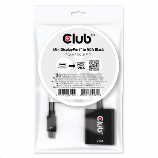| In the box | Club 3D CAC-2113 MiniDisplayPort™ to VGA Black Active Adapter M/F |