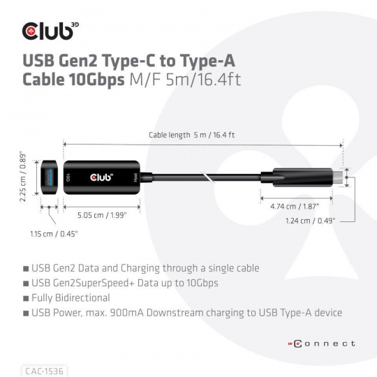 The Club 3D CAC-1536 USB Gen2 Type-C to Type-A Cable 10Gbps M/F 5m/16.4ft cable connects your Notebook, Tablet or Phone with USB Type-C output to your favorite existing Peripherals, Accessories and Chargers featuring the common USB Type-A plug. It enables Data and Power over a single cable and both ways. This cable supports USB 3.2 Gen 2. SuperSpeed+ data up to 10Gbps and up to 900mA output for Downstream charging or powering your USB Type-A enabled Notebook, Tablet or Smartphone.