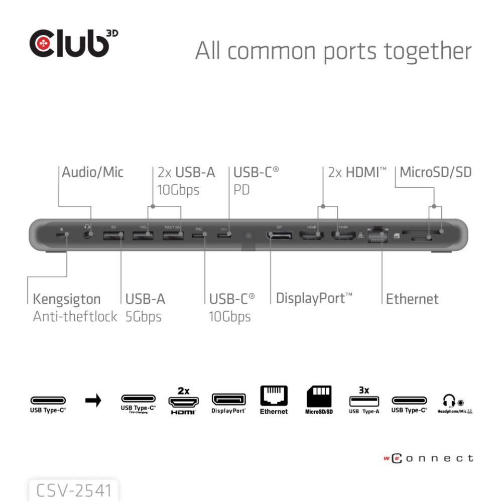 Club3D Dokovací stanice USB-C 12v1, 2xHDMI, 1xDP, 2xUSB-C, 3xUSB, 1xRJ45, 1x3.5mm, černá