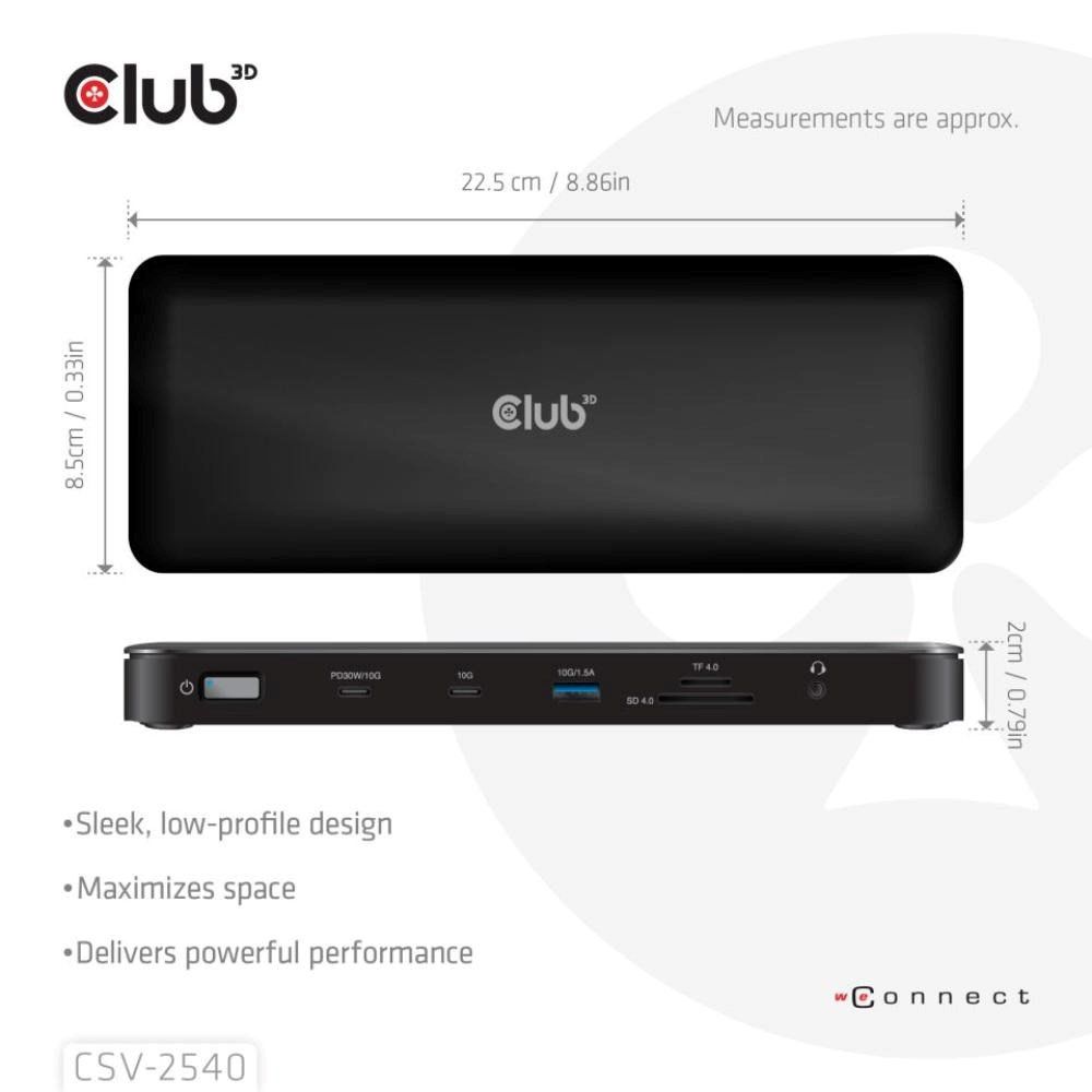 CSV-2540 je přenosná dokovací stanice 14 v 1 USB Type-C® 10Gb/s na čtyřnásobný displej s režimem 2 pruhů DisplayPort™ 2.1 Alt , která slouží k rozšíření portu Type-C® na více portů pro video, data, zvuk, Ethernet a napájení a představuje ideální řešení pro splnění požadavku uživatelů na rozšíření. Má 4 videa (výstup čtyř 4K/60Hz videí současně, pokud hostitel podporuje oba UHBR10&DSC) pro přenos videa, 5 portů USB pro přenos dat. 2,5 Gigabit Ethernet pro ultrarychlý Ethernet, čtečku karet microSD/SD, 3,5mm kombinovaný audio konektor. Kromě toho je tato dokovací stanice vybavena 150W stejnosměrným napájením, které nabízí max. 100 W pro připojený počítač a také max. 30W nabíjení pro mobilní zařízení USB-C.