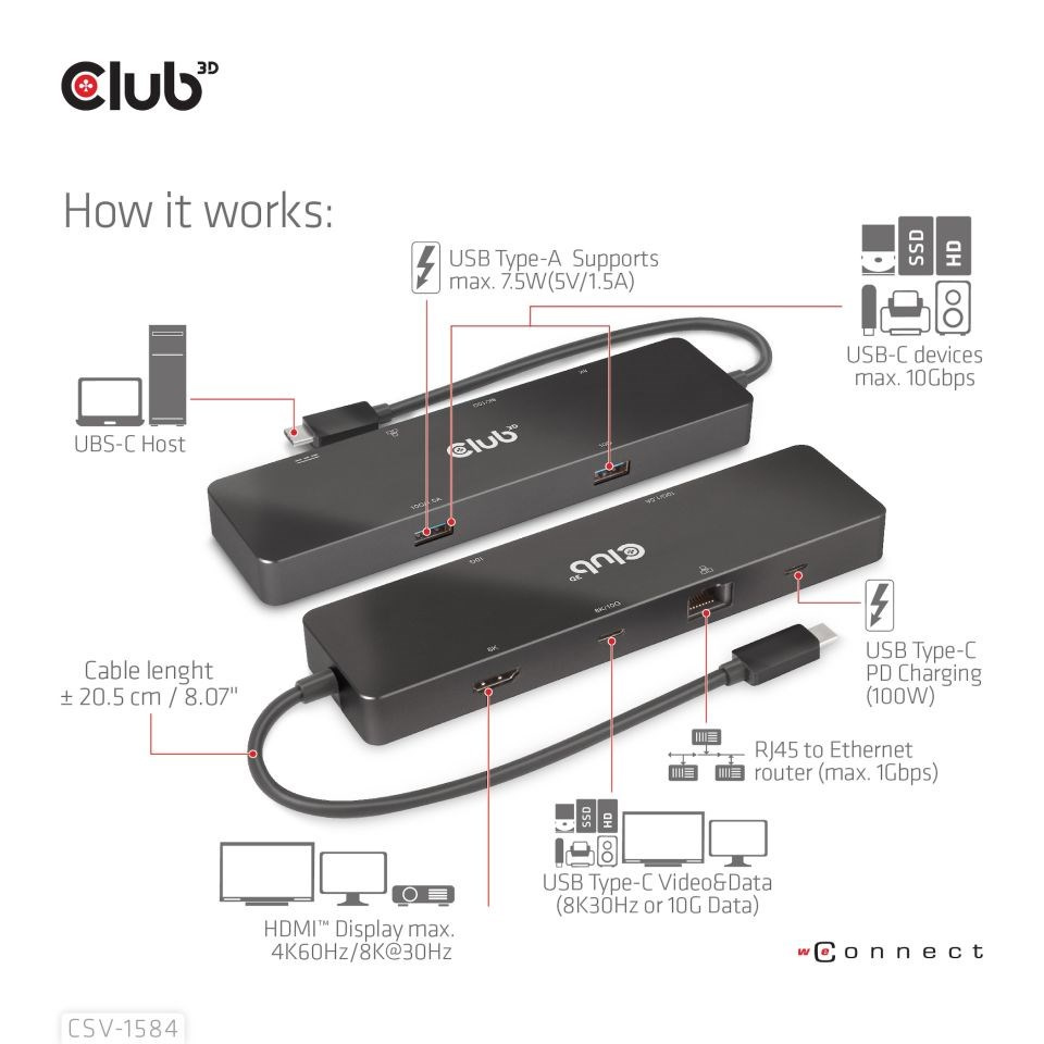 Club 3D CSV-1584 je USB 3.2 Gen2 Type-C, 6-in-1 Hub s HDMI™ 8K30Hz/4K60Hz, 2xUSB Type-A (10G), Ethernet RJ45 (1Gbps) a 2xUSB Type-C, 1x Video 4K60Hz nebo Data (10G) a 1xPD3.0 nabíjení 100 wattů, což poskytuje ideální řešení pro rozšíření portu USB Type-C nebo hostitele Thunderbolt (PC/Laptop/mobilní telefon atd.), zejména pro ty, kteří jsou hostiteli s jedním USB Type-C přístav. Tento rozbočovač využívá integrovaný obvod s podporou režimu DP1.4 Alt, který umožňuje výstup maximálně jednoho 8K30Hz (DSC) nebo dvou různých videí (2krát 4K60Hz) a port USB Type-C Video také podporuje přenos dat USB3.2 Gen2 s maximální rychlostí 10 Gb/s. 2 video porty USB Type-A a USB Type-C umožňují připojit 3 USB zařízení současně. Port Gigabit Ethernet vám umožní surfovat na internetu, port USB Type-C PD Charging podporuje max. 100W PD Charging. Může fungovat na všech hostitelích USB Type-C s podporou režimu DP Alt.