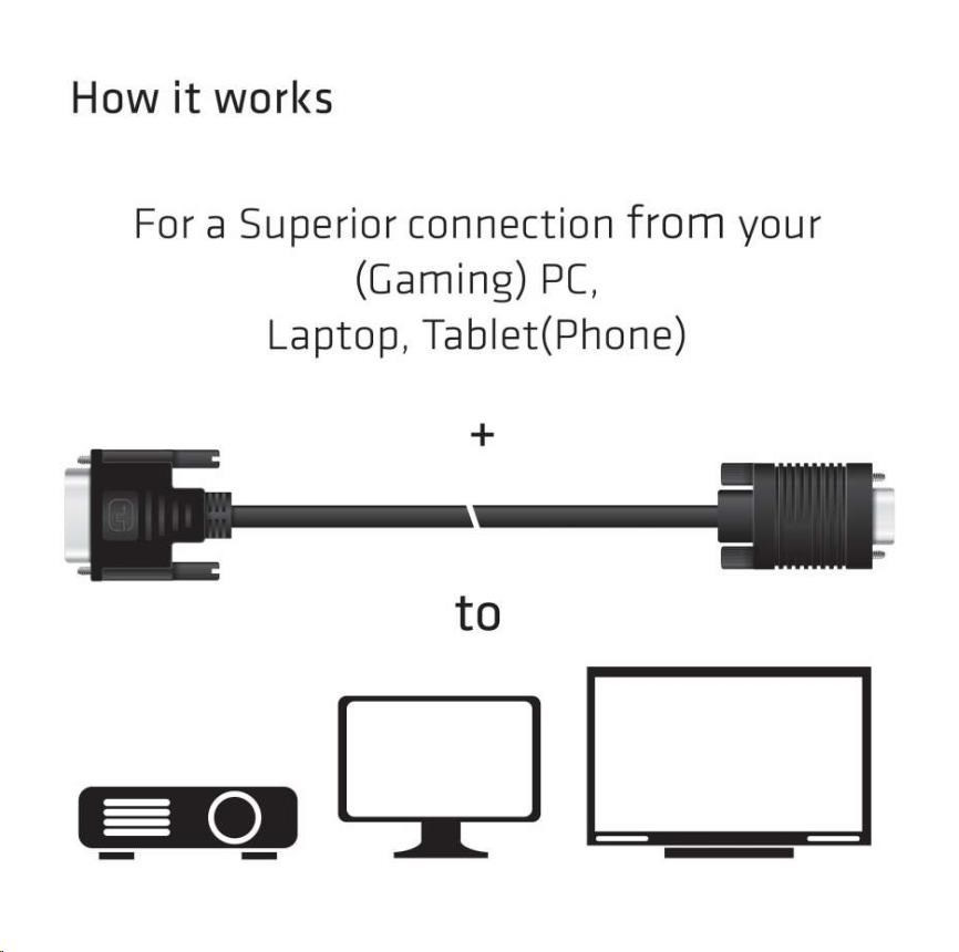 Please use one of our VGA / DVI (Extension/Adapter) cables to connect to your devices: In case you need assistance to choose the correct cable, please visit our website www.club-3d.com or feel free to mail us at support@club-3d.com and it will be our pleasure to assist you.