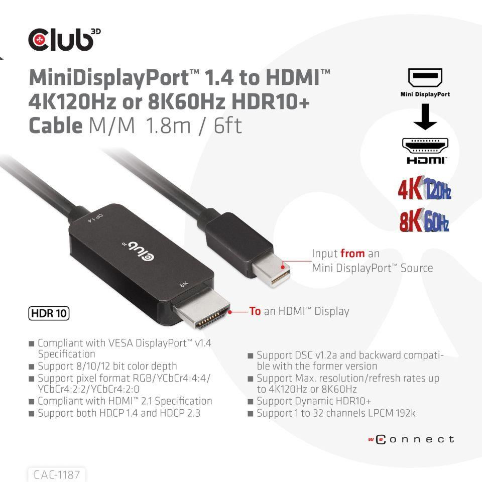 Club3D kabel miniDP 1.4 na HDMI, 4K120Hz nebo 8K60Hz HDR10+, M/M, 1.8m
