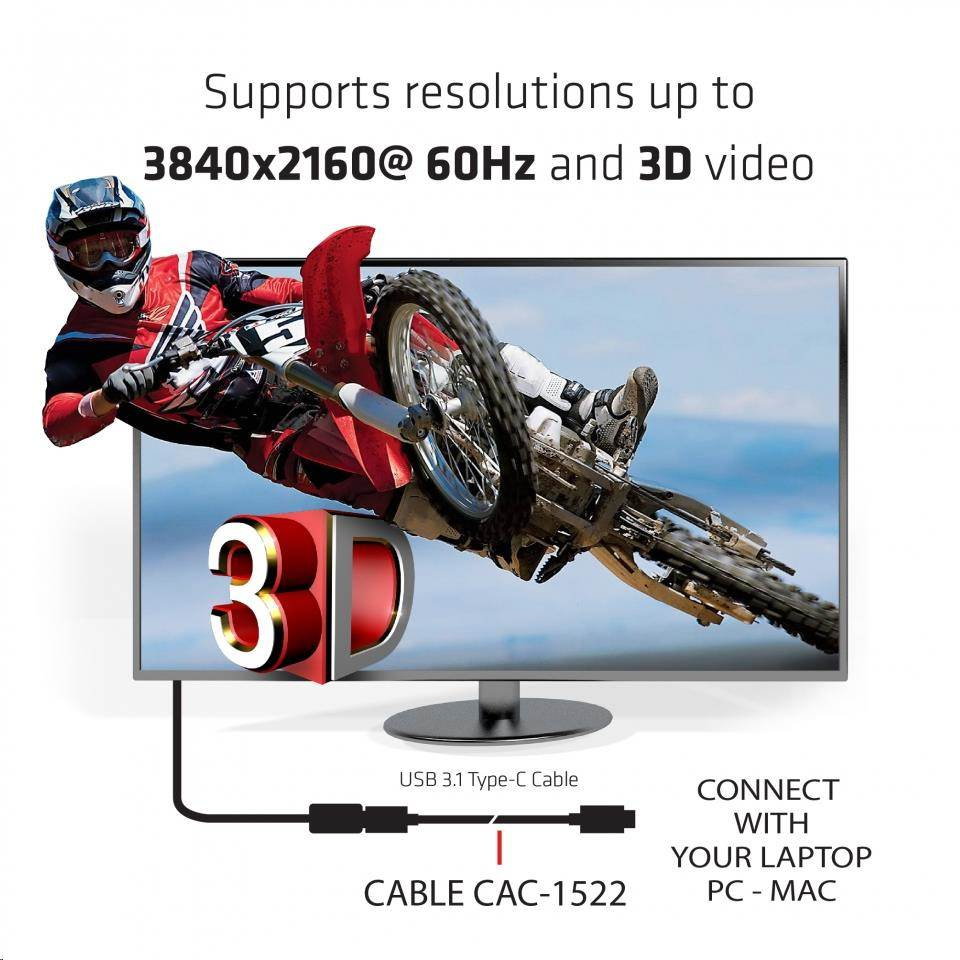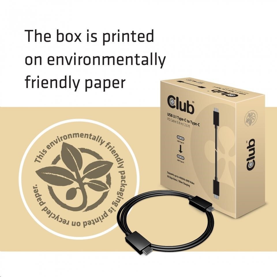 Club-3D USB 3.1 TYPE C MALE TO TYPE C MALE USB 3.1 (10Gbps) Type C PowerDelivery 0.8M/2.6Ft Cable Support 3840x2160(60Hz)