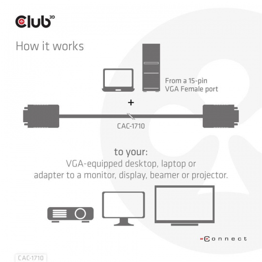 The Club 3D CAC-1710 VGA Cable Bidirectional M/M 10m/32.8ft 28AWG links any VGA-equipped desktop, laptop or adapter to a monitor, display, beamer or projector with a 15-pin VGA Female port. Ideal for at home or work, the cable creates a reliable connection for anything from gaming to video projection and supports up to Full HD 1080p(max. resolution of 1920 x 1080).