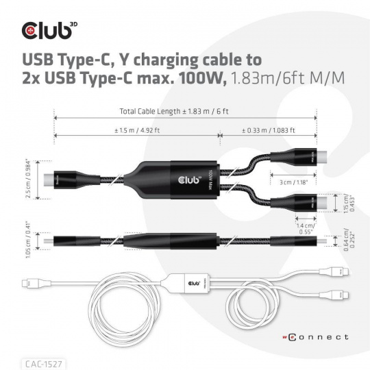 Club3D nabíjecí kabel USB Type-C, Y charging cable to 2x USB Type-C max. 100W, 1.83m/6ft M/M
