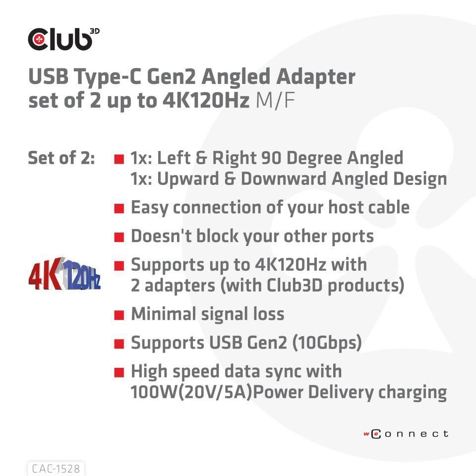 Club3D set adapterů USB-C Gen2 angled adapter set of 2, 4K120Hz, 240W, (M/F)