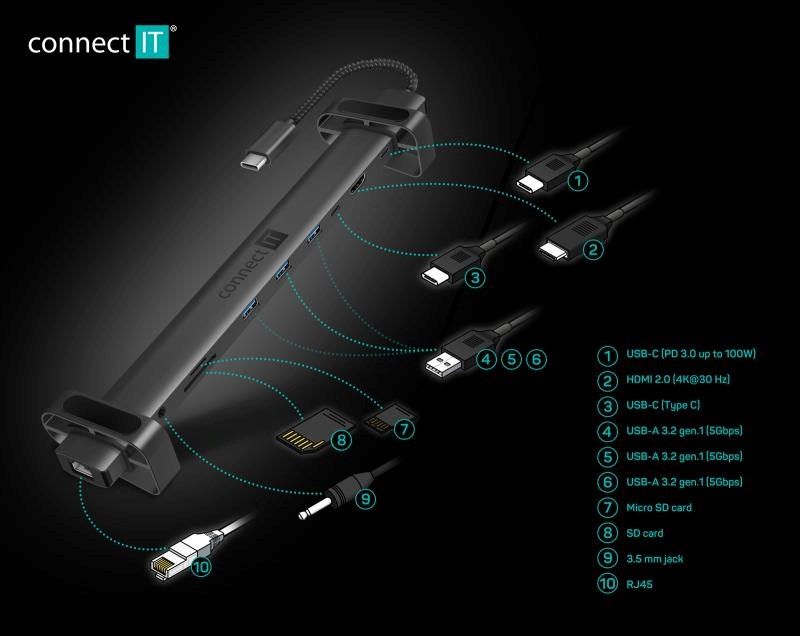 CONNECT IT Dokovací stanice USB-C 10v1, 1xHDMI, 2xUSB-C, 3xUSB, 1xRJ45, černá