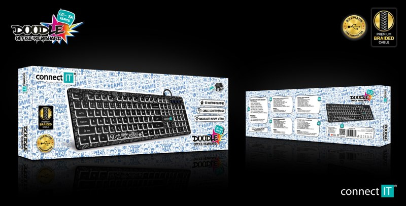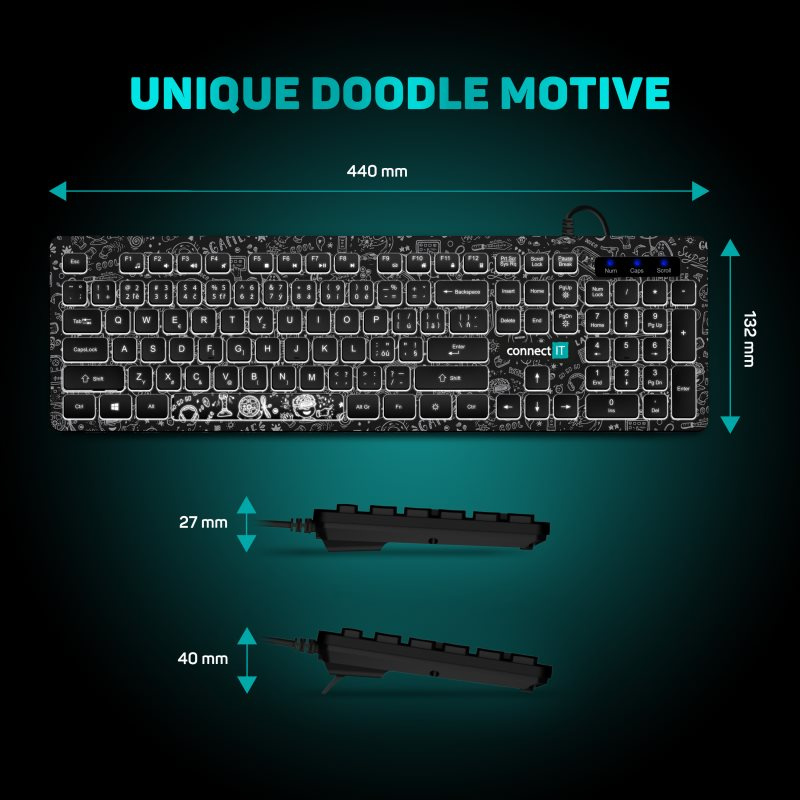 CONNECT IT DOODLE kancelářská drátová bíle podsvícená USB klávesnice, CZ + SK verze, ČERNÁ