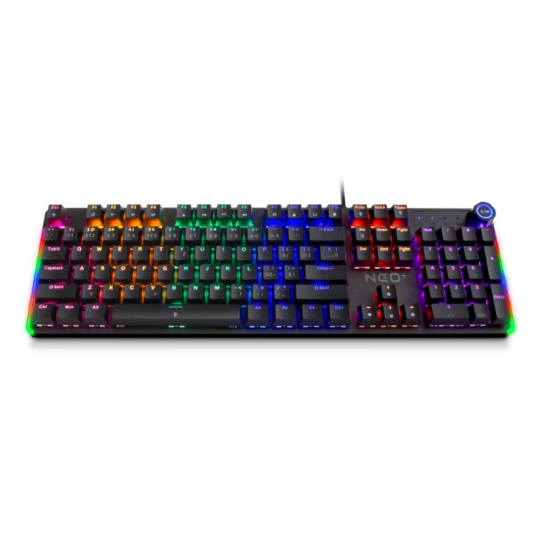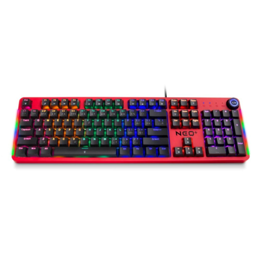 Profesionální mechanická klávesnice NEO2 + series pro hráče počítačových her v českém a slovenském layoutu s devíti módy barevného Rainbow podsvícení. K dispozici je 12 multimediálních kláves a otočné kolečko pro nastavení hlasitosti a dalších funkcí.