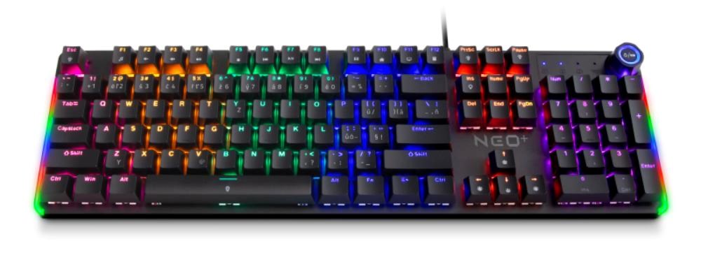 Profesionální mechanická klávesnice NEO2 + series pro hráče počítačových her v českém a slovenském layoutu s devíti módy barevného Rainbow podsvícení. K dispozici je 12 multimediálních kláves a otočné kolečko pro nastavení hlasitosti a dalších funkcí.