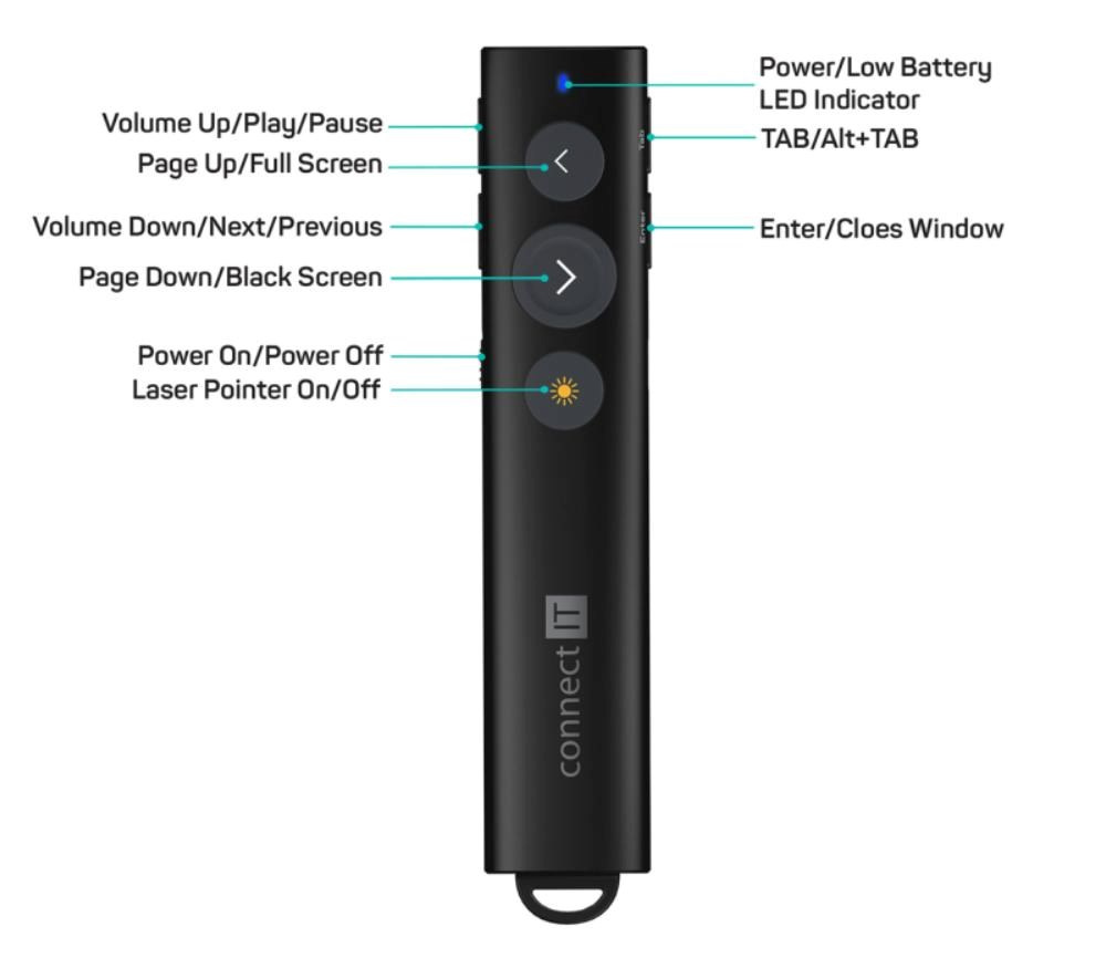 Optimální kombinace bezdrátového prezentéru a laserového ukazovátka z vás udělá profesionála na jakékoliv poradě, přednášce nebo prezentaci. Zamilujete si ho díky jeho nízké hmotnosti a perfektní štíhlému tvaru padnoucímu do každé ruky. V zadní části se nachází praktická schránka na USB přijímač, který už nikdy neztratíte.