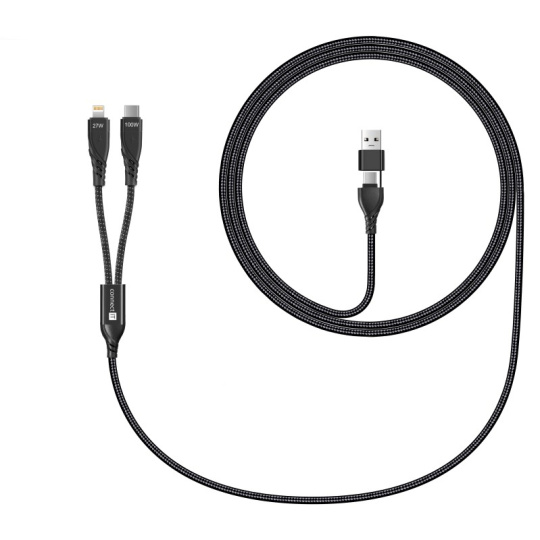 Univerzální nabíjecí kabel 4v1 pro nabíjení zařízení s konektory 1x USB-C a 1x Lightning se vstupním konektrom USB-C a redukcí na USB-A. Umožňuje nabíjení až dvou zařízení současně s podporou rychlého nabíjení pomocí max. proudového toku 5 A. Speciální manžetová nadstavba konektorů zaručuje lepší přístupnost k nabíjecím zdířkám mobilních telefonů v pouzdrech.