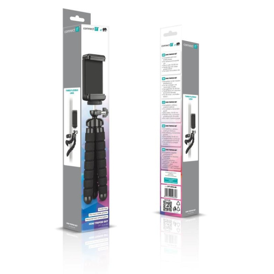 Mini Tripod set s flexibilními nohami, které lze přichytit například na větve stromů, zábradlí, řídítka kola nebo na monitor počítače a mnoho dalších míst a různých úhlů. Gumové zakončení nohou zaručují stabilitu na jakémkoliv povrchu. Mini tripod set je velmi skladný a schová se do každého batohu nebo kabelky, ve složeném stavu měří 24,5 cm a váží pouhých 76 g. Maximální zatížení je 0,5 kg. Součástí Mini Tripod setu je držák, který sedí na šířku většiny telefonů na trhu a je možné ho v něm umístit jak na šířku, tak na výšku, podle potřeby uživatele.