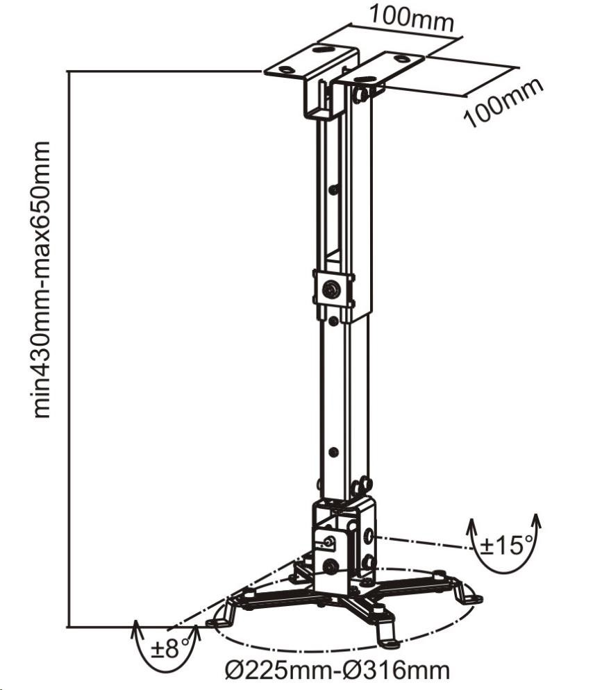 Univerzální držák k montáži projektoru na strop - barva: šedivá - naklápění: ±30° - snadná a rychlá montáž - včetně šroubů a hmoždinek - vzdálenost projektoru od stropu nastavitelná: 43-65 cm - nosnost: 20 kg.