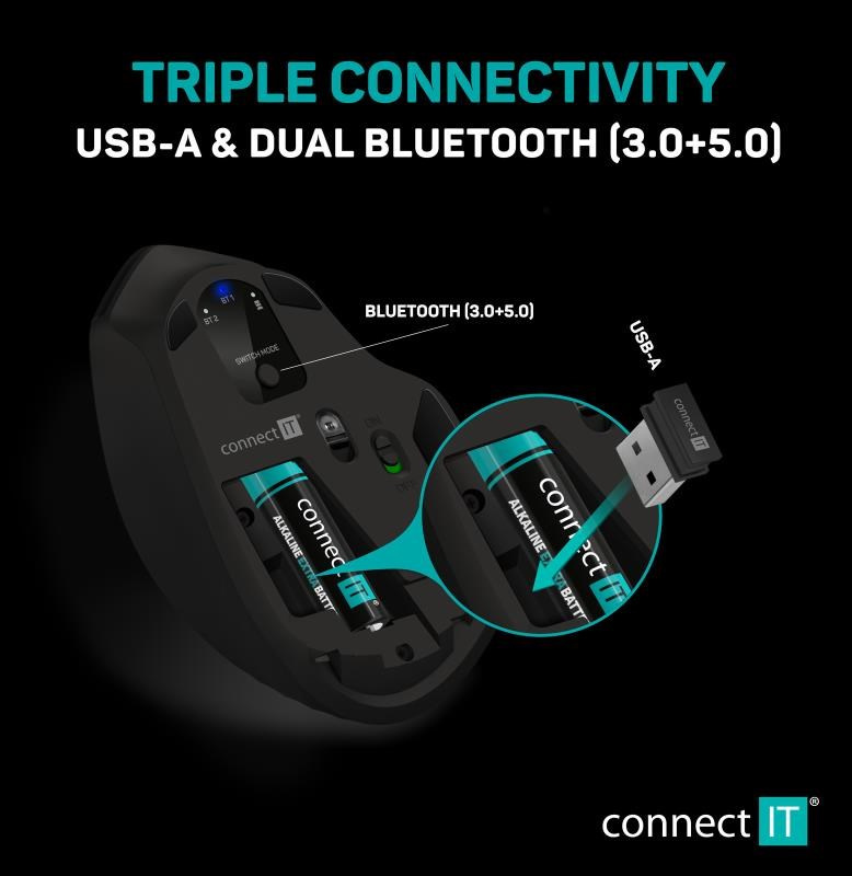 CONNECT IT Triple SmartSwitch bezdrátová myš, 2.4 GHz & BT, černá