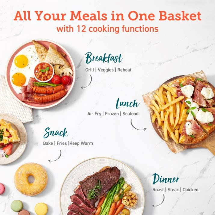 Nechte horkovzdušnou fritézu dělat práci za vás s funkcemi vaření jedním dotykem, jako je smažení horkým vzduchem, pečení, grilování, opékání, ohřívání, kuře, steak, mořské plody, zelenina, hranolky, mražené a udržování jídla v teple. Prozkoumejte další možnosti přizpůsobením vlastních funkcí vaření s preferovaným časem a teplotou.