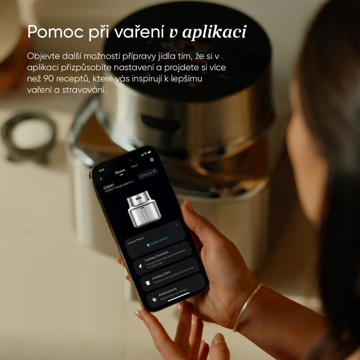 Díky chytré aplikaci COSORI máte vaření vždy pod kontrolou díky notifikacím v telefonu. Najdete zde také recepty, tipy i přesné nastavení pro každý pokrm. Iconic se tak stává vaším tichým, ale vždy připraveným kuchyňským asistentem.