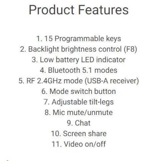 Rozhraní klávesnice:Bezdrátová; Lokalizace klávesnice:EN; Výbava klávesnice:Podsvícené klávesy.