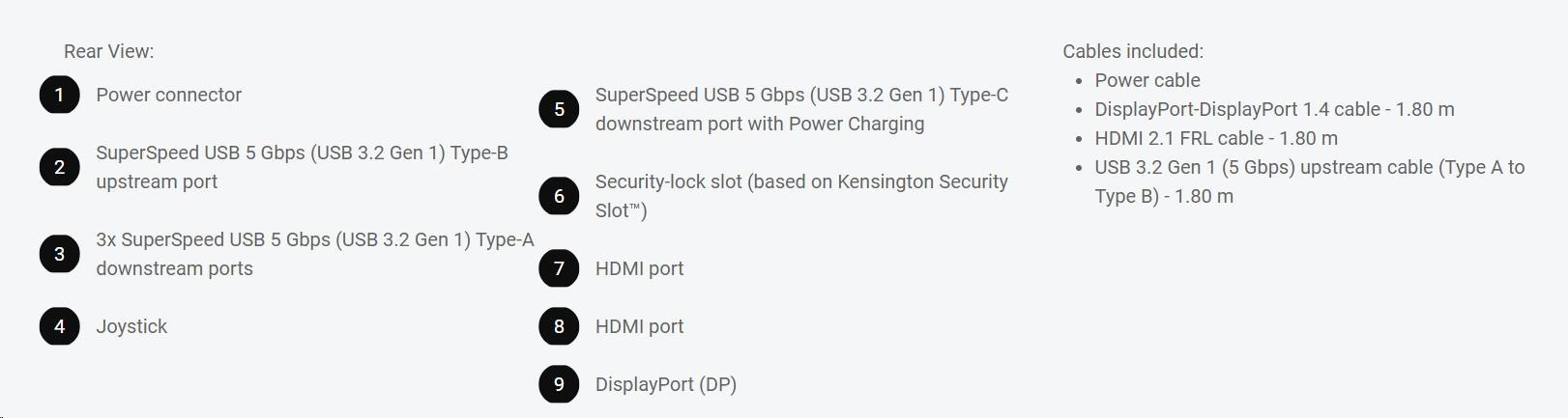 | Power cable ? DisplayPort-DisplayPort 1.4 cable - 1.80 m ? HDMI 2.1 FRL cable - 1.80 m ? USB 3.2 Gen 1 (5 Gbps) upstream cable (Type A to Type B) - 1.80 m |