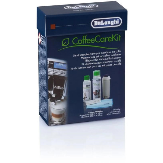 Sada De'Longhi DLSC306 je nezbytná pro udržování kávovaru v perfektním stavu a pro stále stejnou chuť a vůni kávy. Sada od značky De'Longhi je ideální pro čištění espress a kávovarů. Součástí sady DLSC306 je 200 ml přípravku EcoDecalk, který vydrží na 2 odvápnění, čistič Eco MultiClean 250 ml, s ověření tvrdosti vody vám pomůže testovací proužek, případně vám s tvrdostí vody pomůže filtr, který je také součástí. Pro praktické využití je v sadě připojena i utěrka z mikrovlákna.