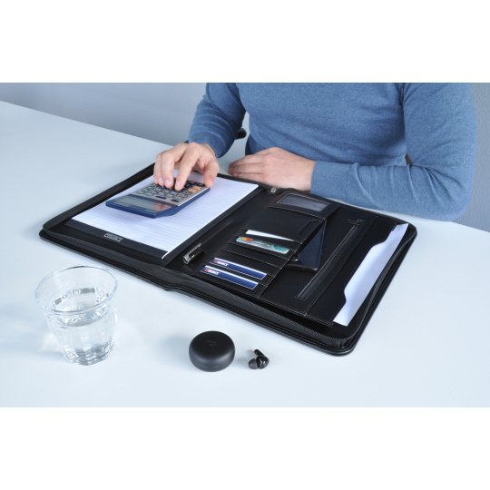 Tato Business Classy konferenční složka je ručně vyrobená z vysoce kvalitní syntetické kůže v minimalistickém designu. ? 13 kapes a přihrádek – ideální pro pera, vizitky a dokumenty ? Speciální kapsa na tablet (lze použít i pro dokumenty formátu A4) ? Uzavíratelná kapsa na zip pro bezpečné uložení cenností ? 8 slotů na karty ? Skrytá kapsa pro diskrétní uložení dokumentů ? Obsahuje poznámkový blok A4 (20 listů) Business Classy konferenční složky spojují praktickou funkčnost s luxusním minimalistickým designem, což zajišťuje profesionální a elegantní vzhled při každé příležitosti. Vnitřní uspořádání je promyšleně navrženo tak, aby byly všechny vaše dokumenty přehledně uspořádány pro schůzky a jednání. Celoplošné zipové uzavření poskytuje maximální bezpečnost, takže si složku můžete vzít kamkoli bez rizika ztráty důležitých materiálů..