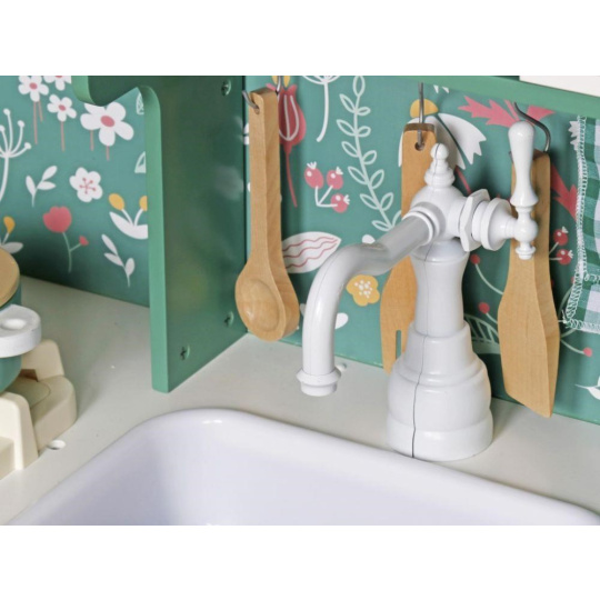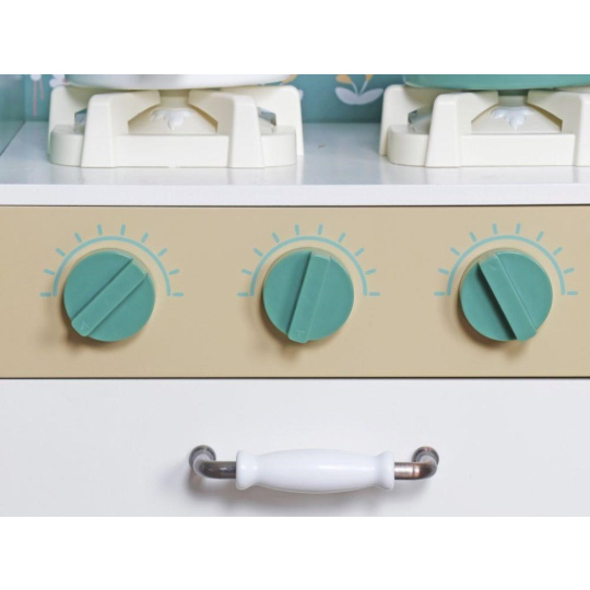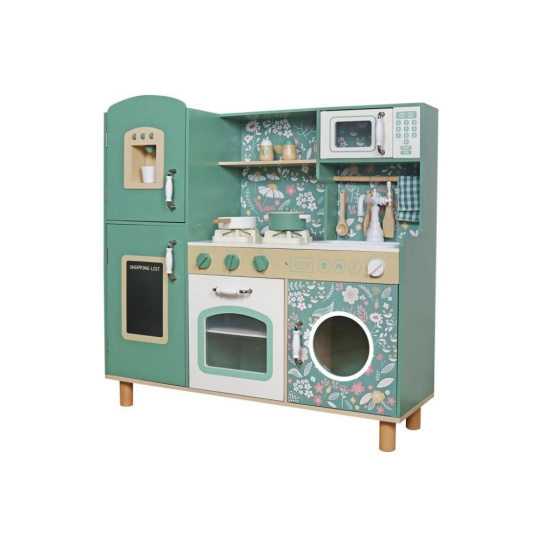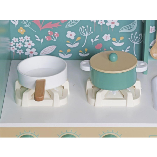 Dětská kuchyňka v krásných barvách, s květinovým vzorem, je stylovou edukativní hračkou pro děti od 3 let věku. V dřevěné kuchyňce s moderními spotřebiči děti popustí uzdu své fantazii, mohou připravovat pokrmy, uvařit kávu a klidně vyprat špinavé prádlo. Jednoduše si vyzkouší dospělácké činnosti bezpečným dětským způsobem. Reálný nádech celé hře dodá sporák se světelnými a zvukovými efekty..